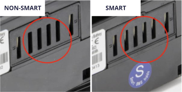 An den Metallsteckern, die in der Fahrradanschlussbuchse sitzen, können Sie erkennen, ob Ihr Fahrradakku ein SMART-System hat oder nicht. Nur die SMART-Fahrradakkus haben auch in den mittleren vier Ports Metallstecker. Darüber hinaus tragen die Akkus mit SMART-System in der Regel einen Aufkleber, auf dem SMART BMS steht (siehe den blauen Aufkleber auf dem rechten Bild), unterhalb des Steckeranschlusses.